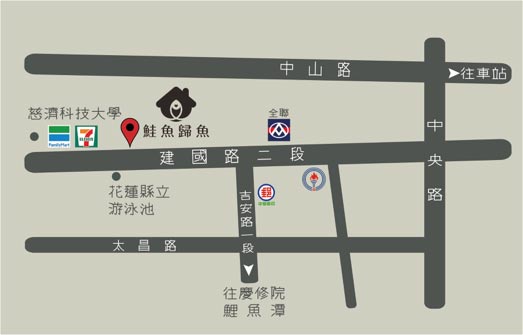 鮭魚歸魚為合法民宿,共有五種不同主題套房,窗戶及陽台可遠眺美麗山景且民宿鄰近市區方便停車。距離花蓮火車站、楓林步道、慶修院等約8~10分鐘車程