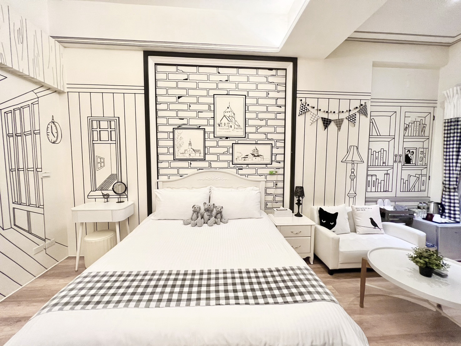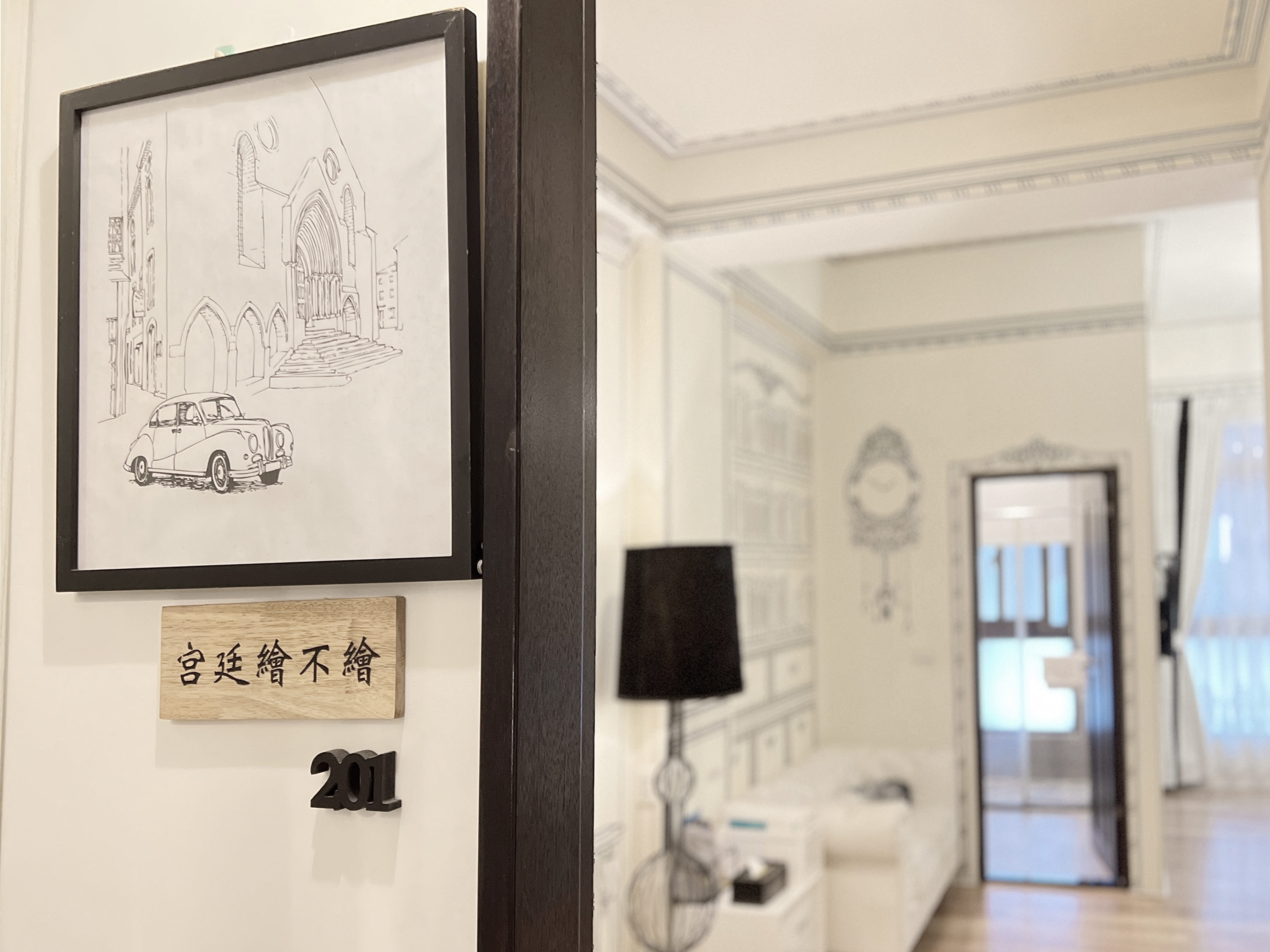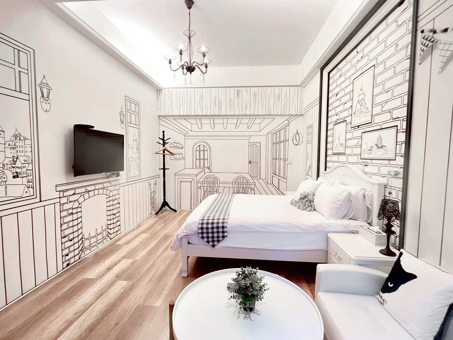 手繪風設計 x 奢華宮廷結合出新視界,以黑白線稿為主題帶出新古典氣息,搭配上典雅華麗的家具,線條描繪出立體空間讓視覺延伸,期待您可以在房間享受典雅的優閒時光。