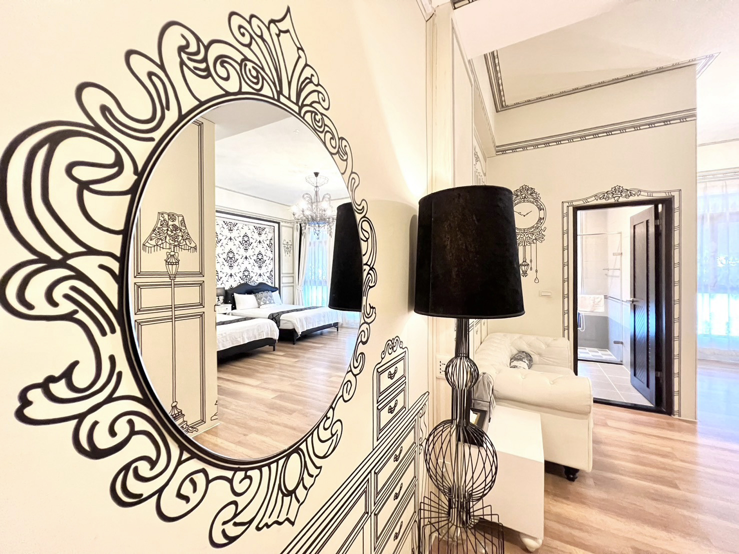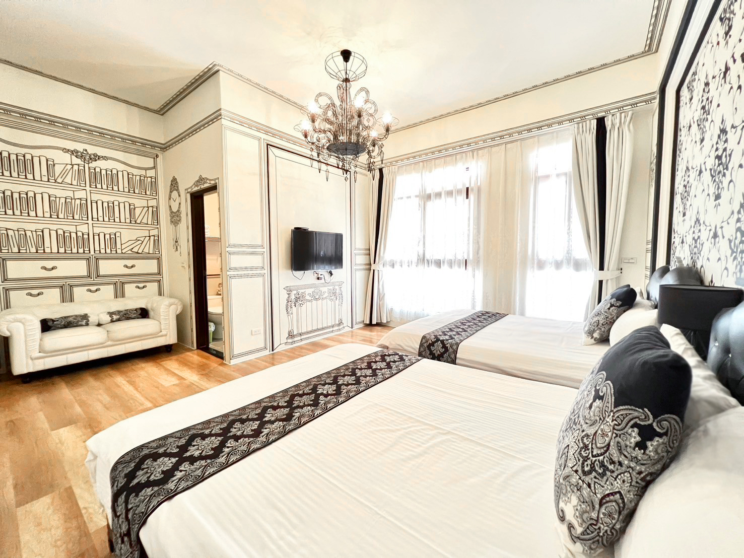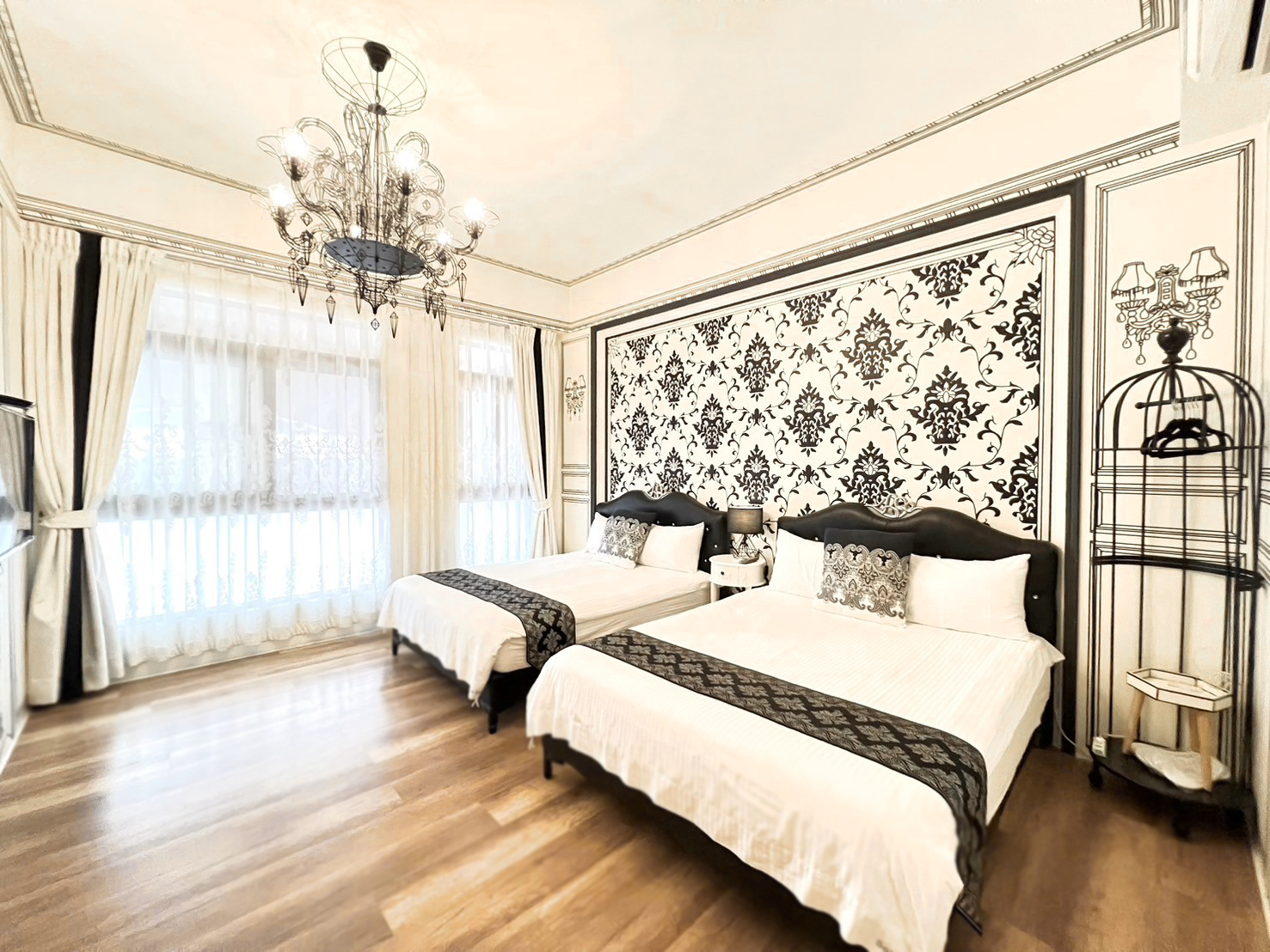 手繪風設計 x 奢華宮廷結合出新視界,以黑白線稿為主題帶出新古典氣息,搭配上典雅華麗的家具,線條描繪出立體空間讓視覺延伸,期待您可以在房間享受典雅的優閒時光。