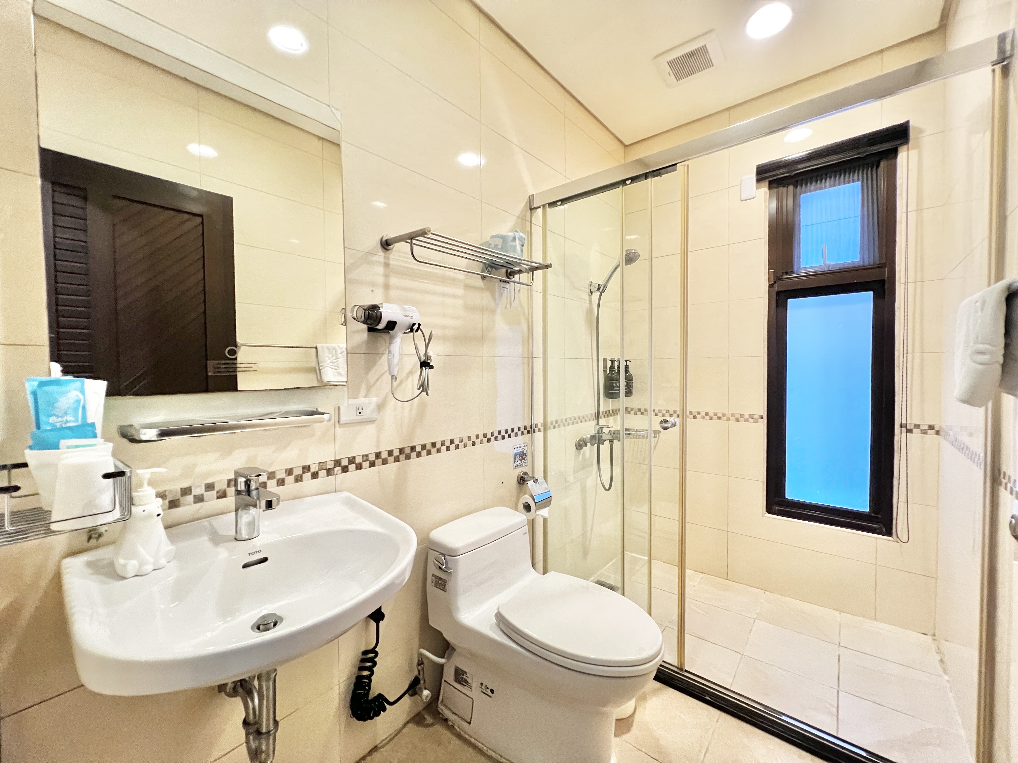 青黃色調 x 幾何圖形的微妙融合,帶點沉穩的微文青風格,幾何簡約的房型設計搭配室內豪華浴池,不僅洗滌疲憊的身心,更帶給旅客們最舒適放鬆的氣息。